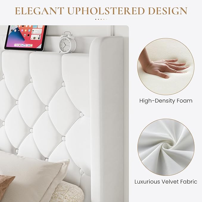 SHA CERLIN Queen Size Platform Bed Frame with Charging Station, Velvet Wingback Headboard with Storage Shelf, Wooden Slats Support, Ample Under-Bed Space, No Box Spring Needed, Easy Assembly, White
