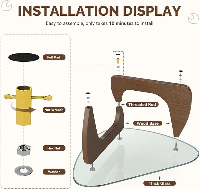 - 【Premium Material】The high-strength tempered glass surface are wear-resistant, scratch-resistant, heat-resistant, waterproof, shatterproof and easy to maintain. The edges of the glass coffee table are designed with elegant curves, smooth and preventing scratches. Also,the translucent glass enhances light and space,giving people a refreshing visual effect. The table legs are made of FSC-certified wood and can be used for a long time.