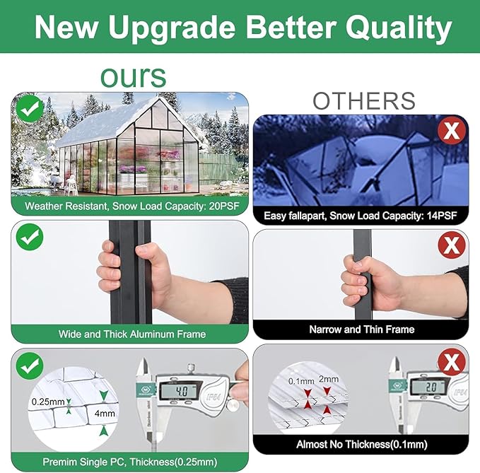 - 🌻Sturdy Frame: Our greenhouse kit boasts a robust rust-resistant aluminum frame designed to withstand various weather conditions. 2 skilled enthusiasts can assemble this greenhouse kit within just 4-6 hours. Introducing patented technology, Easy assembly, saving you 50% of your time. Gone are the days of tedious setups. With a simple push and locking screw, our Quick Connect ensures a reliable, secure, and swift link-up. It can also support snow loads of up to 20PSF.