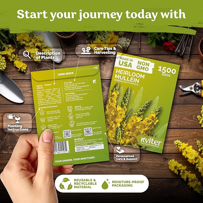 KVITER 3,000 Mullein Seeds for Planting (Verbascum Thapsus), 2 Pack – Mullein Herb, Heirloom Seed Non GMO Organic – Ideal for Herb Garden – US Grown Herbs Flower Seeds