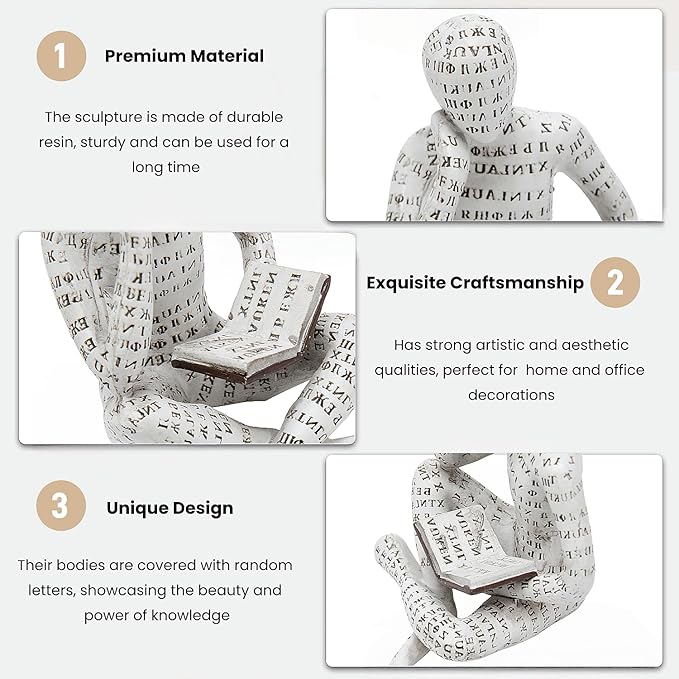 - 【Aesthetic Decor】: This thinker sculpture depicts a man reading a book, and his body is covered with letters, which intuitively shows the beauty and power of intellectual human. It's a good way to bring you a calm mind in busy days, creating a cozy and peaceful atmosphere.