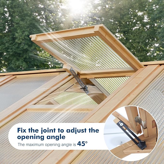 - 【Adjustable Vent Window】Maximum opening angle of 45 degrees, allowing you to lock it at any position within this range as needed. This design maintains indoor warmth during winter while promoting air circulation, creating an optimal environment for plant growth.