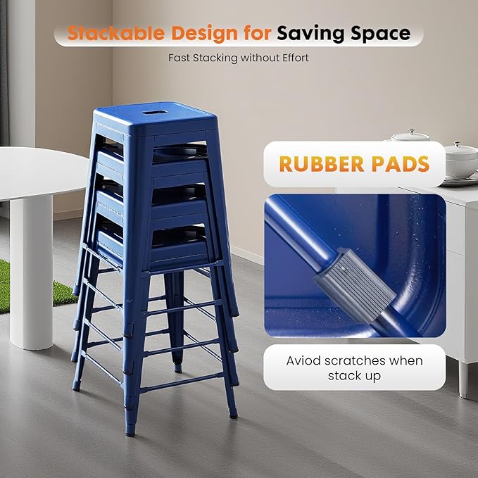 - 【Space-Saving & Portable】 Lightweight and stackable, these metal stools can be easily stored when not in use. The convenient hole design allows for effortless moving.