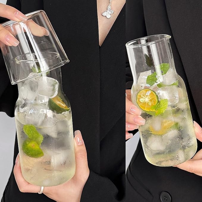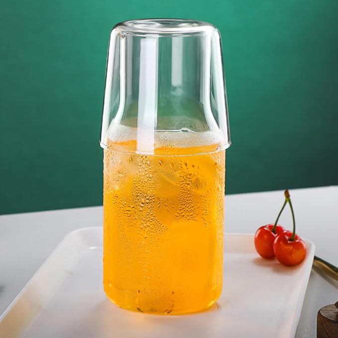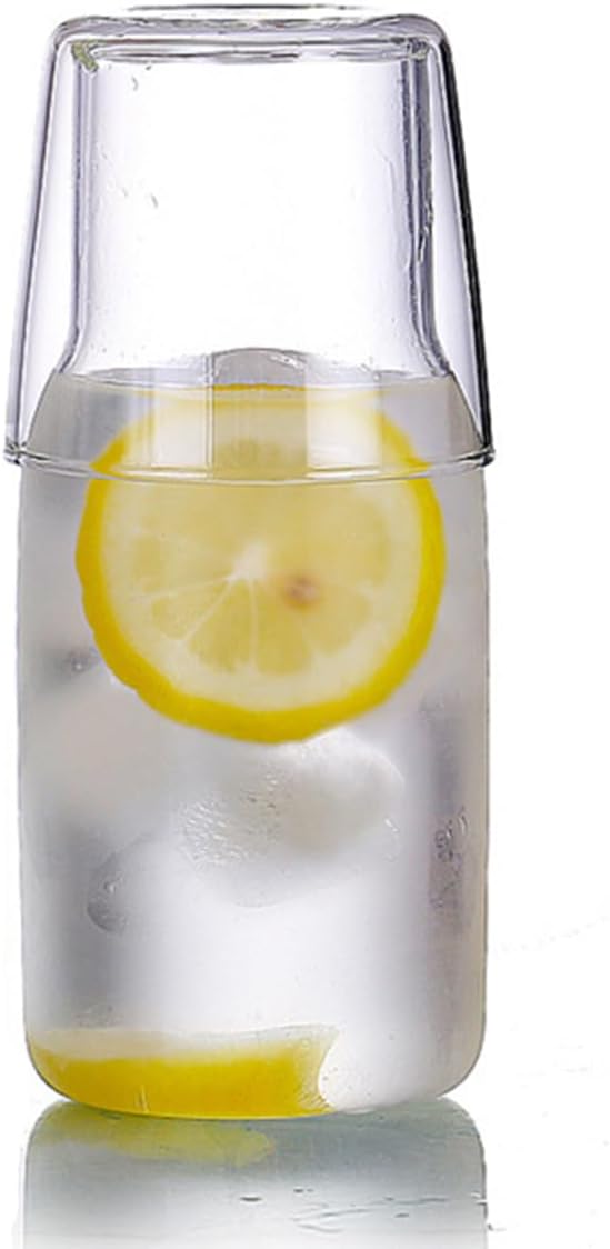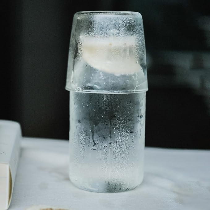 - Large Capcity the Bedside Water Carafe Set: This practical bedside water carafe set includes a 500ml (17oz) clear glass carafe and a matching tumbler glass, forming a 2-in-1 solution for daily hydration. The tumbler not only serves as a drinking cup but also acts as a tight-fitting lid for the carafe —ideal for placing on bedroom nightstands.