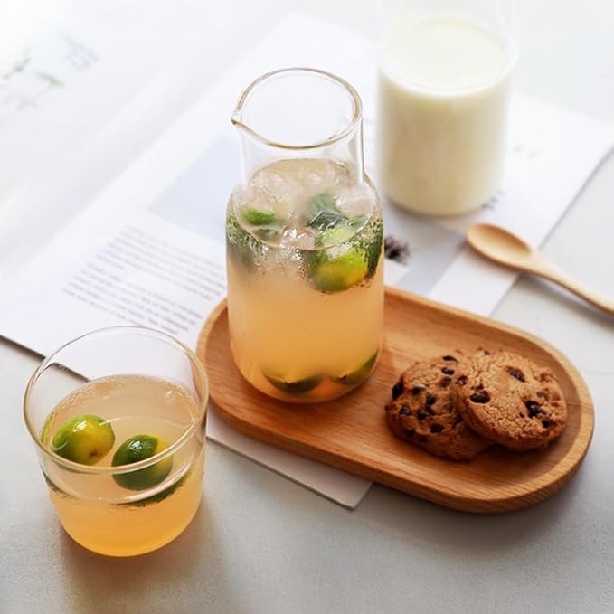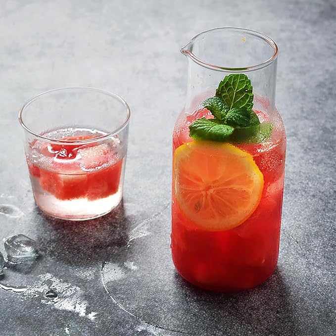- Sinple Design of the Bedside Water Carafe Set: The bedside water carafe set features a clear glass design that complements any home decor style—whether modern, rustic, or classic. The carafe has a wide mouth for easy filling with ice or fruit slices,Its compact size saves space on small nightstands.