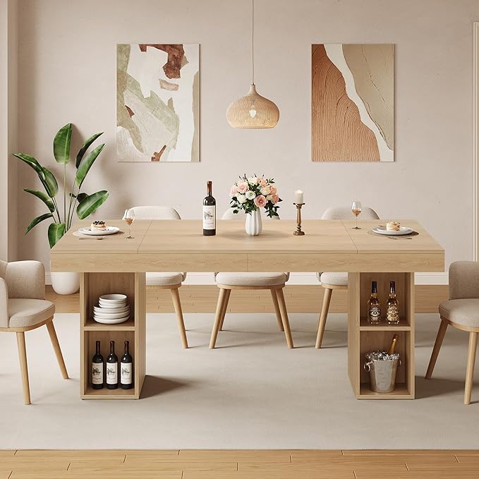- 【Double-Sided Large Storage】 This 71-inch dining table features open storage compartments on both sides of its base—three compartments on one side and two on the other, for a total of 10 storage spaces, perfect for storing tableware and daily necessities. It's perfect for busy families who need extra storage while creating a stylish and uncluttered dining environment. This table is not only suitable for dining, but also doubles as a coffee table, casual table, or guest table.