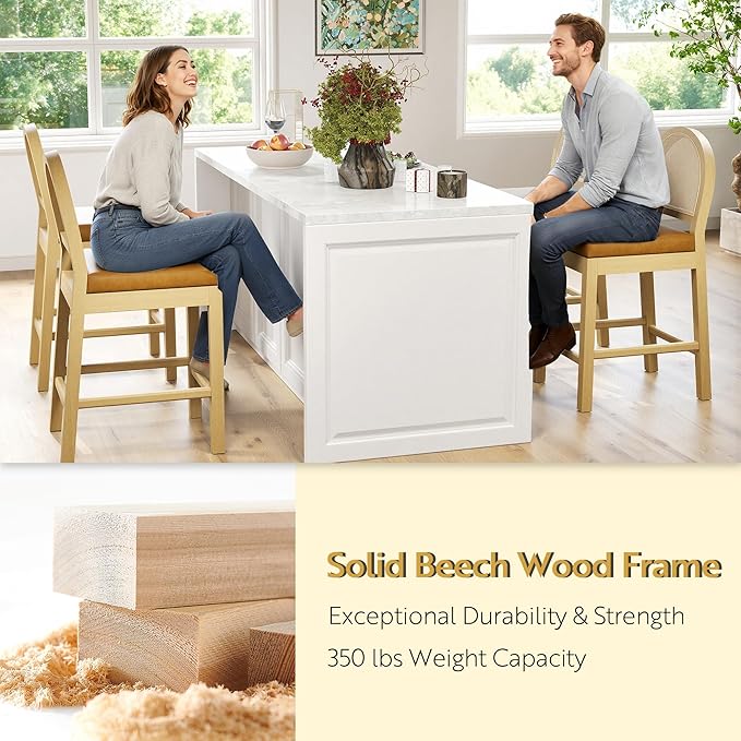 - Ergonomic Curved Back & Spacious Seat: The rounded backrest follows the curve of your spine for natural lumbar support, while the wider and deeper seat design ensures roomy comfort for everyone. Measuring 16.92"W × 17.5"D × 38.97"H with a 17.5" seat depth, these wooden bar stools blend ergonomic design and elegant style—ideal for both home dining and entertaining spaces.