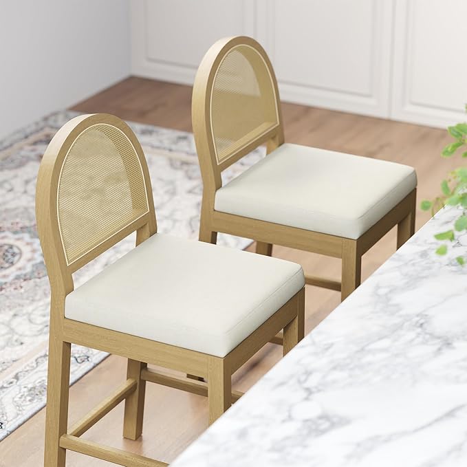- Farmhouse Boho Style Bar Stools: Want to create a cozy and welcoming corner at home? These rattan bar stools combine natural solid wood with handwoven cane backs and a gracefully arched silhouette. Wrapped in soft cream chenille, they bring timeless warmth to your kitchen island, breakfast nook, or bar area—perfect for morning coffee, brunch with family, or relaxing evening chats.