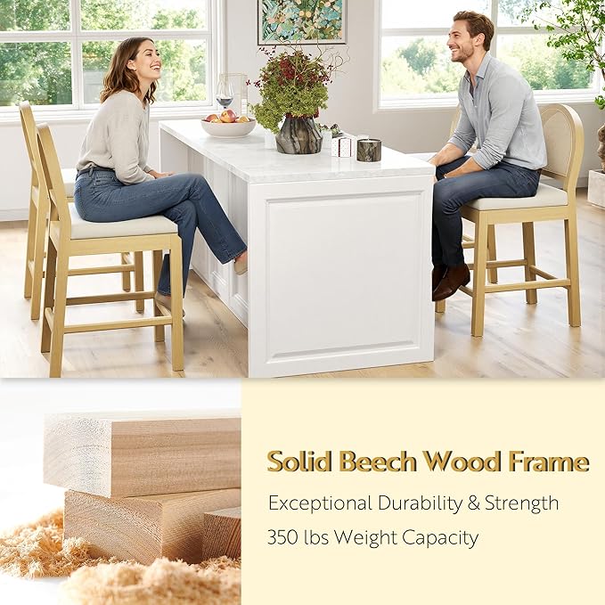 - Solid Wood Frame & Plush Chenille: Built with a 100% solid wood frame, these bar stools ensure outstanding durability and a 350 lbs weight capacity. The handwoven rattan back adds breathability, while the 3.1-inch seat cushion wrapped in premium chenille fabric feels incredibly soft and gentle on the skin. Chenille’s fine weave resists pilling and keeps a fresh, elegant look even with daily use. Filled with high-density foam, the seat provides cloud-like comfort—perfect for long conversations over dinner or relaxing moments at your kitchen counter.