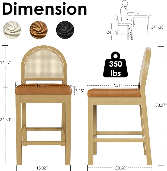 - Farmhouse Boho Style Bar Stools: These rattan bar stools combine a solid wood structure with a handcrafted cane back and elegant arched silhouette. The brown faux leather seat enhances the natural tone, creating a warm and classic look that suits any décor. Ideal for cozy breakfasts, casual chats, or evening cocktails by the kitchen counter, these counter height bar stools add timeless beauty and comfort to your home.