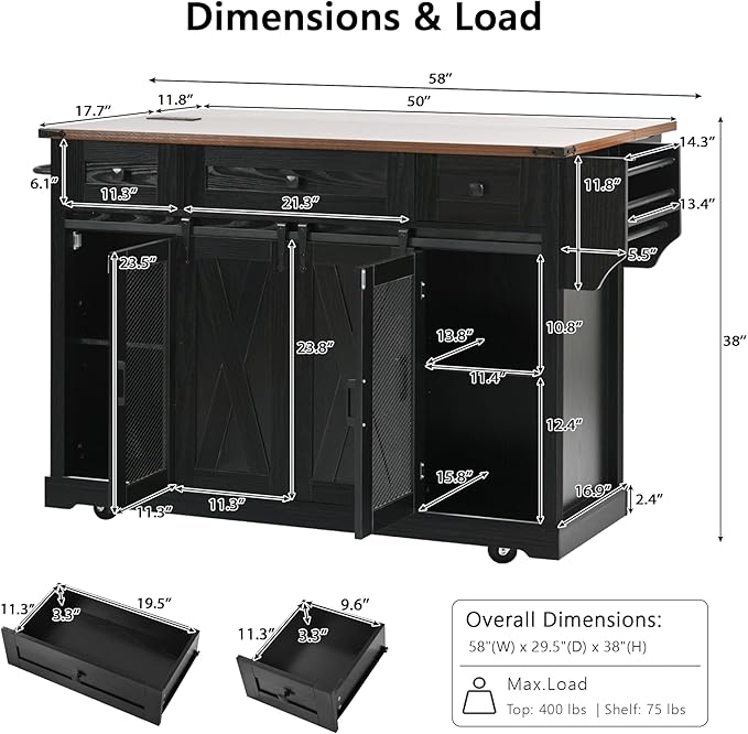 - [Effortless Assembly and Dimensions] Island Cabinet: 58" L x 29.5" W x 38" H; Accompanied by comprehensive assembly instructions and labeled parts, this kitchen island ensures a seamless setup. For any assembly challenges, please reach out for assistance.