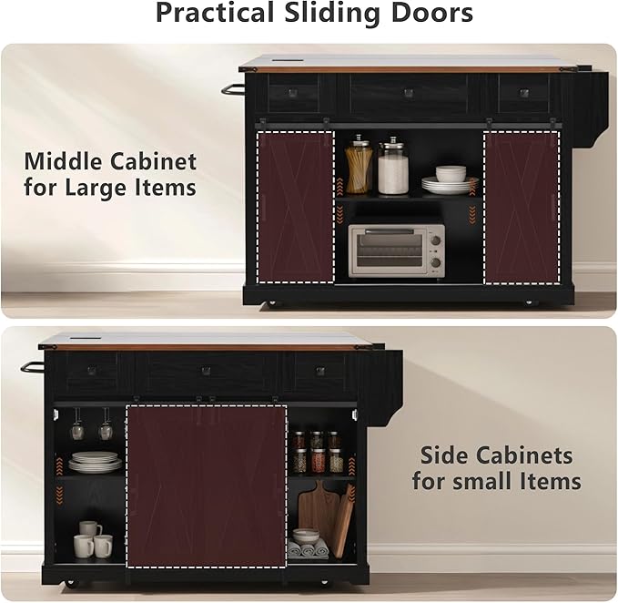 Merax Farmhouse Rolling Kitchen Island on Wheels with Drop Leaf Table & Power Outlet, Wood Kitchen Cart on Wheels with Spice Rack, Glass Holders, 3 Drawers & Cabinet, 58" Wide Black