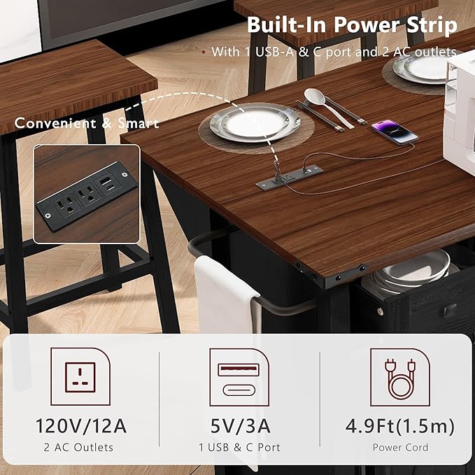 - [Upgraded Built-In Power Station] This kitchen island features a sophisticated built-in charging station with 2 AC outlets, 1 USB port, and 1 Type-C port, accommodating all your kitchen appliance needs. Perfect for charging coffee makers, juicers, and Type-C devices, its versatile design suits various kitchen activities.