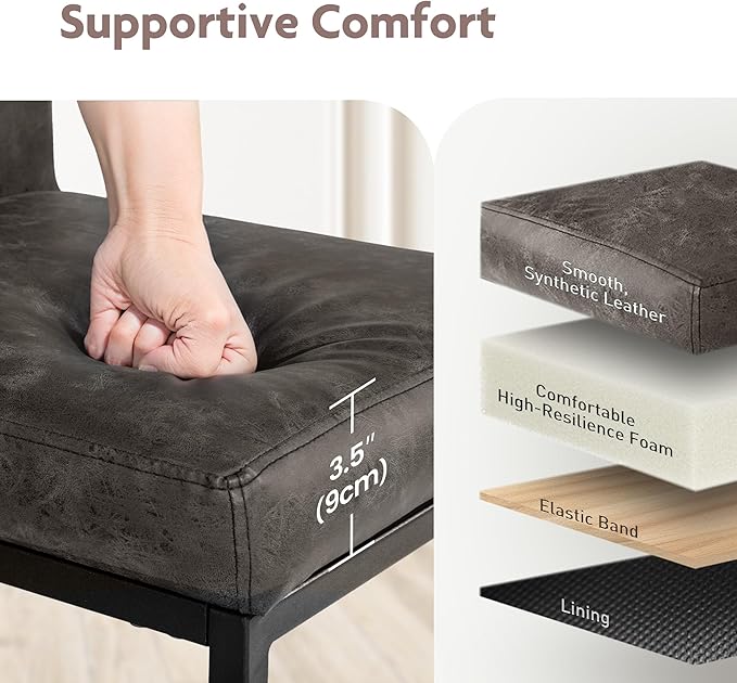 - [Upholstered PU Leather Seat]: The kitchen counter stools feature a retro matte leather surface that efficiently prevents water and stains, making cleaning easy. The 3.54" thick upholstered seat design with a soft backrest ensures a cozy seating experience. Upgrade your dining area now use our stylish counter height bar stools!