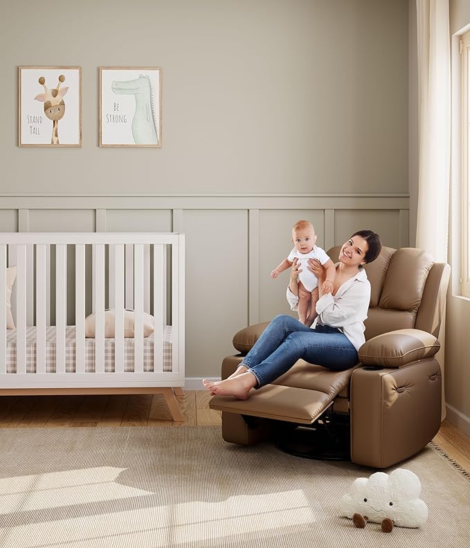 27" Oversized Power Recliner Chair, Faux Leather Rocking Chair with Heat & Massage, 360° Swivel Modern Electric Recliner with Cup Holder & USB Charging for Living Room, Bedroom, Nursery - Khaki