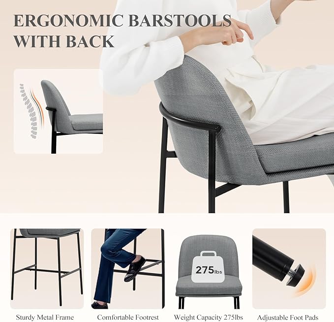 - ERGONOMIC BAR STOOLS WITH BACK: Bar stools with premium material & ergonomic backrest.Thick cushioned back & double cushion for a comfortable seating experience. Ergonomically designed seat for optimal comfort during long periods of sitting. The soft cushioned seat provides ample comfort for long periods of sitting, making it great for enjoying a meal at the kitchen counter or having a drink at the bar.