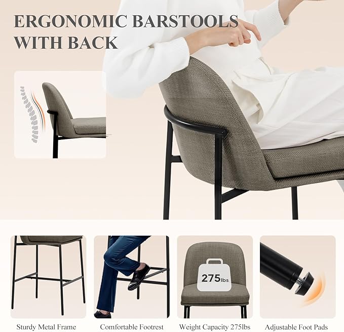 - ERGONOMIC BAR STOOLS WITH BACK: Bar stools with premium material & ergonomic backrest.Thick cushioned back & double cushion for a comfortable seating experience. Ergonomically designed seat for optimal comfort during long periods of sitting. The soft cushioned seat provides ample comfort for long periods of sitting, making it great for enjoying a meal at the kitchen counter or having a drink at the bar.