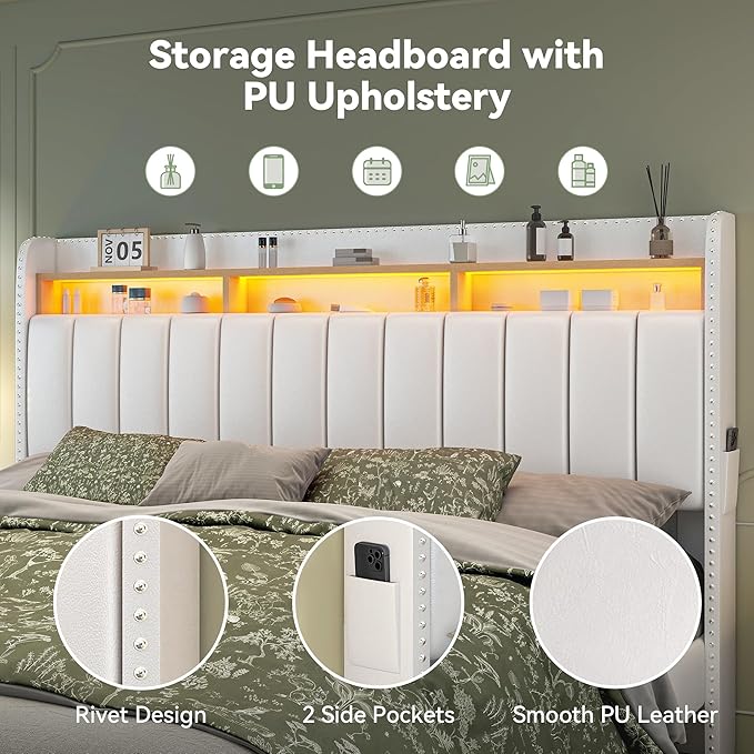 - Queen Bed Frame with Storage: The headboard features 2 tier storage compartments ideal for books, perfume, or decor. Additionally, the wingback sides include 2 pockets great for small essentials like phones or remotes. The end of the bookcase bed frame includes 2 large drawers provide ample room for clothes, toys, or bedding. The drawers come with transparent zipper covers, helping keep your belongings clean, visible, and well organized