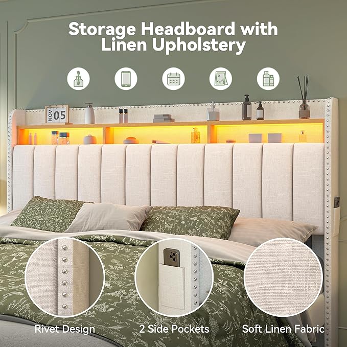 - Linen Upholstered Headboard Beds: Sink into comfort with the mattress foundation's linen fabric upholstery, complemented by high-density foam padding that supports your back when sitting up. The elegant nailhead trim along the bed sides adds a classic and sophisticated design element, making the upholstered bed frame both a cozy retreat and a stylish centerpiece for your bedroom