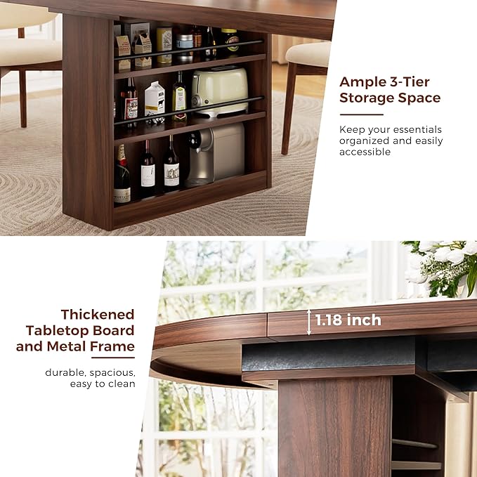- Extra Large Storage Space: Both ends of the kitchen table feature three open shelves at different heights, offering convenient storage for tableware and kitchen essentials. Keep everything organized, within easy reach, and your tabletop clutter-free. Whether for family dinners or gatherings with friends, this walnut dining table with storage creates a clean, organized, and inviting dining space